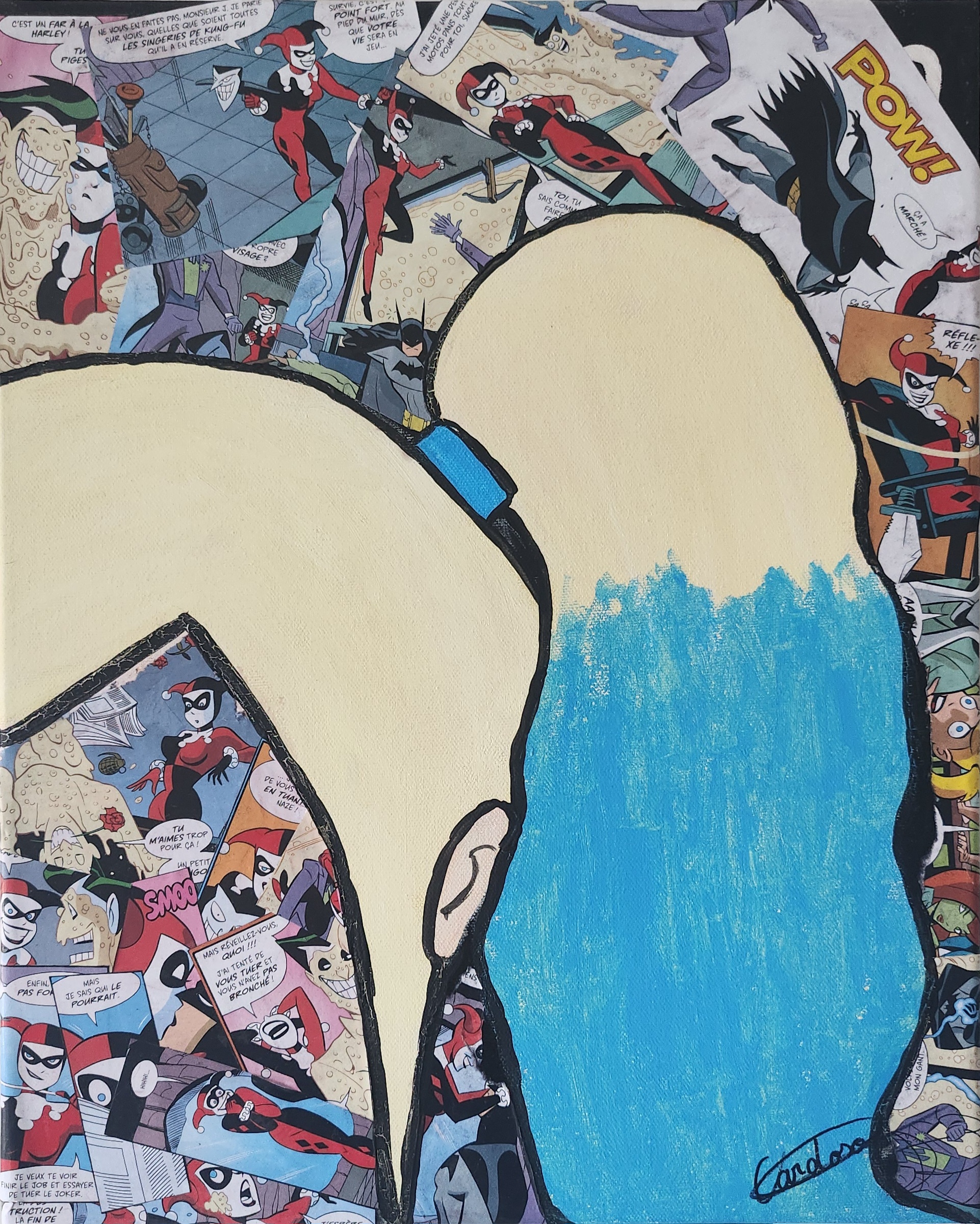 A work that combines comic book collage and acrylic paint.