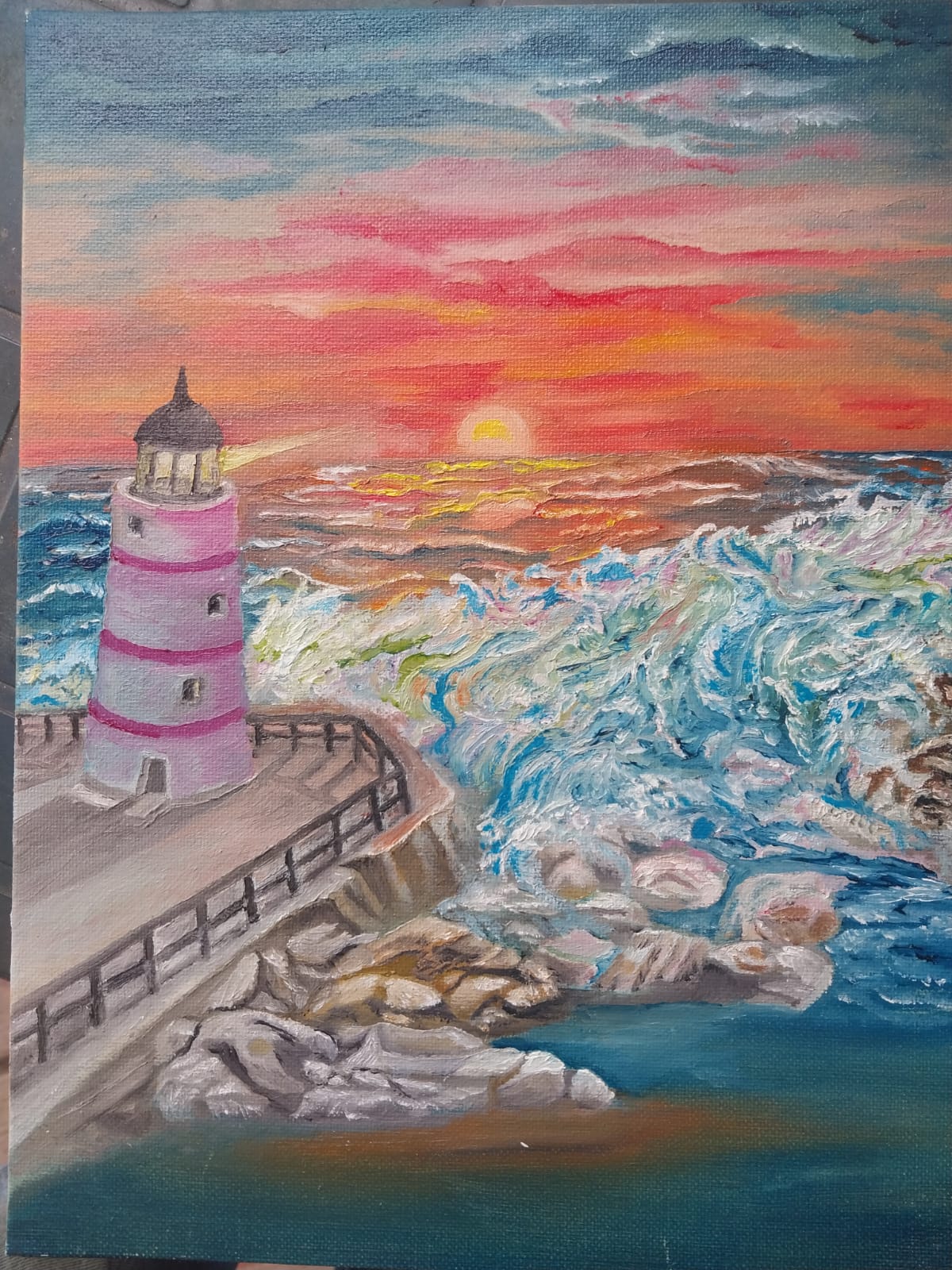 Lighthouse on rocky ledge with raging waves hitting rocks on shore original on 11×14 canvas panel pv